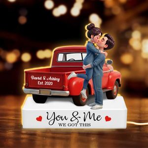 Celebrate love, commitment, and shared journeys with a glowing keepsake that speaks straight from the heart. This personalized light box captures attention with its charming illustrated couple sharing a kiss beside a vintage pickup truck, paired with the heartfelt message “You & Me – We Got This.” Custom printed with your names and special year, it turns a romantic moment into meaningful farmhouse-inspired décor. With its warm illumination and personal touch, this light box is a beautiful reminder that no matter where life takes you, you’re always in it together.