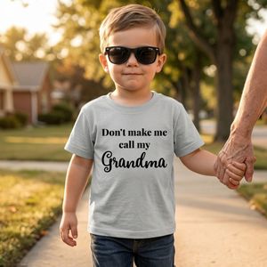 BMSM10 BMSM15 BMSM20 Bring smiles, laughs, and a little playful attitude to your child’s wardrobe with this fun and cheeky shirt. Featuring the bold “Don’t Make Me Call My Grandma” message, this design adds humor and personality while celebrating that special grandparent bond. Perfect for everyday wear or family gatherings, it’s a lighthearted way for kids to show just how powerful grandma’s love really is.