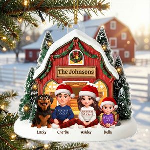 BMSM10 BMSM15 BMSM20 Capture the warmth and joy of the holiday season with this stunning 3D-effect Christmas barn house ornament. Featuring a festive red barn decorated with Christmas wreaths and garlands, this ornament showcases a personalized family scene with each member sitting together in cozy holiday attire. With names and the year included, this ornament becomes a unique keepsake that celebrates the togetherness of family during the holidays. The vibrant details and charming design make this ornament a perfect addition to any Christmas tree, creating lasting memories year after year.