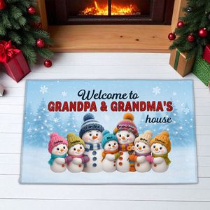 BMSM10 BMSM15 BMSM20 Welcome guests with warmth and holiday cheer using thisPersonalized 3D Effect Christmas Doormat featuring Grandma, Grandpa, and their adorable grandkids as a family of snowmen. This festive design captures the joy of family gatherings and the love that fills every grandparent’s home during the holidays. Personalize each snowman with names to create a one-of-a-kind doormat that will make everyone smile the moment they step inside.