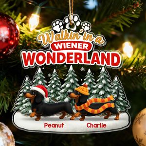 BMSM10 BMSM15 BMSM20 Bring holiday cheer and dachshund charm to your Christmas tree with this 3D Effect Dachshunds Walking In A Wiener Wonderland Ornament! Perfect for proud dog parents, this festive acrylic ornament features adorable dachshunds strolling through a snowy forest scene — complete with hats, scarves, and plenty of personality. Personalize it with your pups’ names to create a joyful tribute to your furry family members. It’s a delightful blend of humor, holiday spirit, and heartwarming detail that makes every dog lover smile.