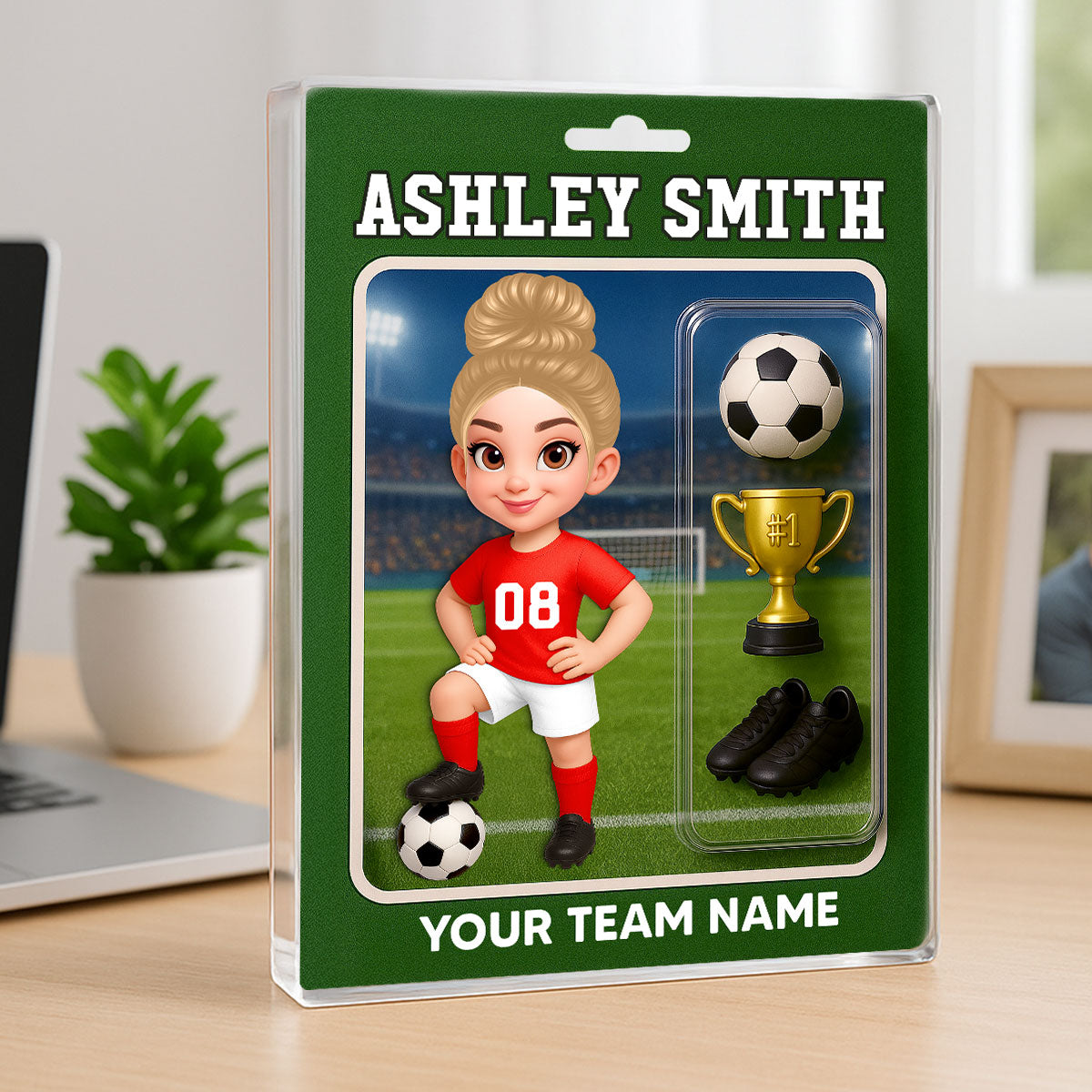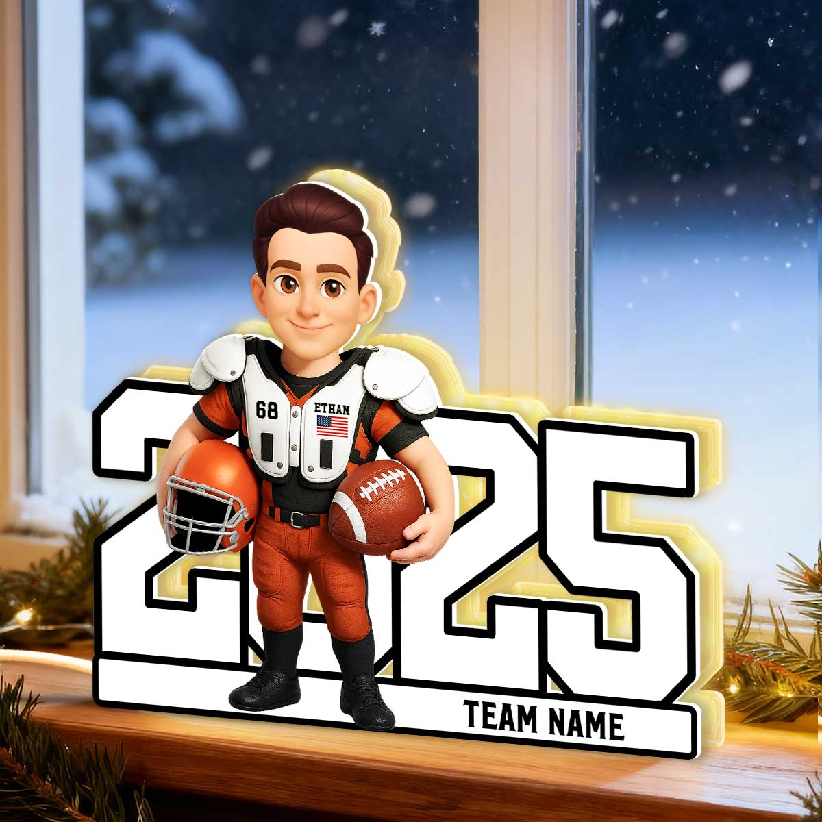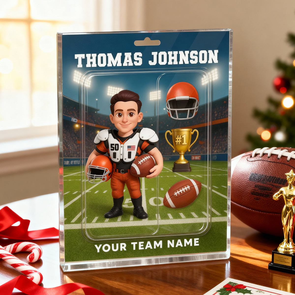 Celebrate the athlete in your life with this unique 3D effect acrylic ornament! Featuring a personalized football player in full gear, holding both a football and a helmet, it’s a perfect keepsake for players, coaches, and fans. Customize with a name, number, team name, and year to make it truly one-of-a-kind. Whether you're honoring a young football player or showing team spirit, this ornament brings both excitement and holiday cheer to any tree.