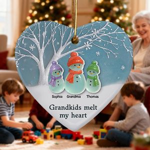 Celebrate the special bond between Grandma and her grandkids with thisPersonalized 3D Sea Glass Effect Ornament. Featuring an adorable snowman family with customizable names, this heart-shaped ceramic ornament adds a heartwarming touch to your Christmas tree. The unique acrylic pieces create a beautiful sea glass effect that catches the light, symbolizing love that shines bright across generations. A perfect keepsake that reminds Grandma how much her grandkids truly melt her heart.