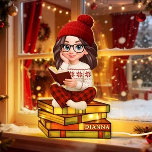 BMSM10 BMSM15 BMSM20 Bring the magic of cozy holiday evenings to life with the 3D Stained Glass Effect Christmas Cozy Vibe Pretty Girl Reading Book Personalized Light Box. Featuring a charming girl in festive pajamas and glasses, sitting on a glowing stack of books while reading, this unique décor piece perfectly captures warmth, relaxation, and Christmas spirit. Personalized with a name, it’s a beautiful keepsake for book lovers who treasure quiet moments during the holidays.