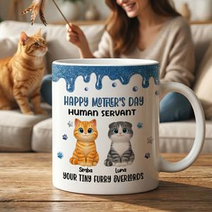 BMSM10 BMSM15 BMSM20 Make her smile every morning with a mug that perfectly captures the hilarious truth of cat ownership. This personalized mug features adorable custom cats with their names, paired with the playful message “Happy Mother’s Day Human Servant – Your Tiny Furry Overlords.” It’s the perfect blend of humor and love, turning her daily coffee or tea into a joyful reminder of her favorite little companions.