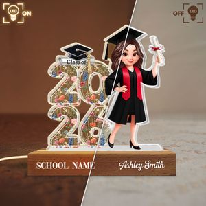 BMSM10 BMSM15 BMSM20 Celebrate a once-in-a-lifetime achievement with this elegant and inspiring personalized acrylic block LED night light. Featuring a confident graduate illustration paired with a beautiful floral Class of 2026/2027 design, this keepsake instantly captures attention and pride. Personalized with a name and school, it transforms graduation day into a lasting memory—blending accomplishment, style, and soft illumination into a meaningful display piece that honors her hard work and bright future ahead.