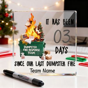 BMSM10 BMSM15 BMSM20 Bring humor and team spirit to any workspace with a desk plaque that instantly grabs attention. This personalized acrylic block features a vivid, printed 3D-effect dumpster fire scene—perfect for teams who know the chaos all too well. The writable surface adds interest by letting you update the number of days since the “last incident,” while personalization with your team name creates desire through a fun, relatable inside joke. Encourage action by gifting it to coworkers, managers, or friends who appreciate a good laugh during hectic workdays.