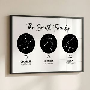 BMSM10 BMSM15 BMSM20 Turn your family’s story into a stunning piece of celestial art with a design that’s as meaningful as it is elegant. This personalized zodiac constellation poster beautifully showcases each family member’s star sign, name, and birthdate, creating a timeless tribute to your unique bond. With its minimalist yet striking style, it captures attention instantly, sparks curiosity, and becomes a heartfelt centerpiece that celebrates connection written in the stars.