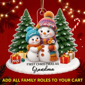 BMSM10 BMSM15 BMSM20 Celebrate a magical first Christmas in a new family role with this heartwarming printed acrylic ornament, designed to capture attention through its adorable 3D-effect snowman duo. The cozy winter hats, colorful scarves, and cheerful forest backdrop build instant interest, while the personalized names and role create emotional desire—turning this charming ornament into a keepsake that marks a meaningful milestone. Whether it’s her first Christmas as Grandma, Mom, or Big Sister, this ornament encourages you to honor the joy, love, and excitement of welcoming a new chapter.