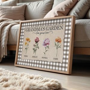 BMSM10 BMSM15 BMSM20 Bring charm and heartfelt meaning into Grandma’s home with a keepsake that celebrates the flowers she loves most – her grandchildren. This gingham-patterned personalized poster instantly captures attention with its cosy, country-inspired design, builds interest through beautifully illustrated birth month flowers, and creates deep emotional connection by customising each bloom with a grandchild’s name. Printed in high-quality detail on premium poster material, it’s a thoughtful Mother’s Day gift for Grandma or Mom that feels both timeless and personal.