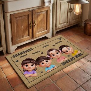 BMSM10 BMSM15 BMSM20 Let everyone know where the love (and the treats) never stop! This personalized “Grandkids Spoiled Here” doormat adds a warm, playful touch to any entryway while celebrating the joy of being a grandparent. Customized with adorable grandkids’ names and character designs, this professionally printed doormat turns Grandma and Grandpa’s home into the official headquarters for hugs, cookies, and unforgettable memories.