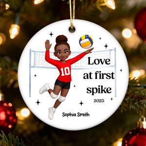BMSM10 BMSM15 BMSM20 Celebrate the passion and excitement of volleyball with this “Love at First Spike” personalized ceramic ornament. Designed to capture the energy and spirit of the sport, it features a dynamic volleyball player in action with her personalized details and a playful message. Perfect for any volleyball enthusiast, this ornament adds a touch of fun to your holiday décor while commemorating a love for the game. Whether you’re gifting it to a player, coach, or fan, it’s a perfect way to showcase their dedication and love for volleyball.