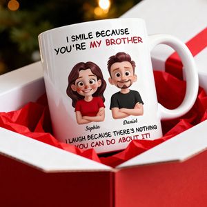 Bring laughter to your mornings with this My Sister Brother Funny Personalized Mug! Featuring adorable cartoon characters and a playful quote — “I smile because you’re my brother. I laugh because there’s nothing you can do about it!” — this mug perfectly captures the fun (and teasing!) bond between siblings.