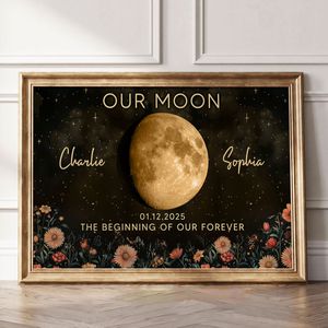 BMSM10 BMSM15 BMSM20 Celebrate the beauty of your love story with this stunning personalized poster, featuring a custom moon phase, the names of you and your partner, and a meaningful date. Set against a starry night sky and a bed of colorful flowers, the design symbolizes your love as timeless as the moon. The phrase "The Beginning of Our Forever" makes it an unforgettable keepsake, perfect for an anniversary, wedding, or any milestone in your relationship.
